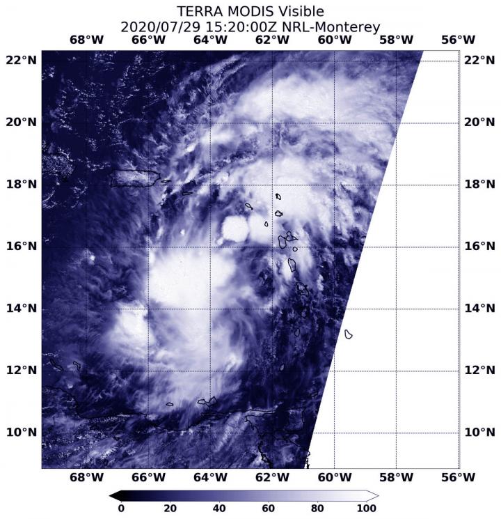 image: NASA's Terra satellite provided a visible image to forecasters of Potential Tropical Cyclone 9 on July 29 at 11:20 a.m. EDT (1520 UTC) after it moved into the eastern Caribbean Sea.
