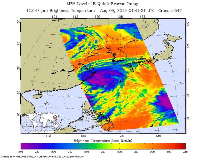 image: On Aug. 9, 2019 at 12:41 a.m. EDT (441 UTC) the AIRS instrument aboard NASA's Aqua satellite analyzed Lekima's cloud top temperatures in infrared light. AIRS found coldest cloud top temperatures (purple) of strongest thunderstorms were as cold as or colder than minus 63 degrees Fahrenheit (minus 53 degrees Celsius) in the thick band of thunderstorms around the eye and in bands north and southeast of the center.