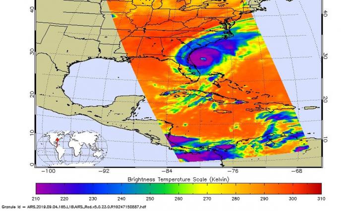 image: This false-colored infrared image taken from NASA's Aqua satellite on Sept. 4 at 2:29 p.m. EDT (18:29 UTC) shows Dorian after it re-strengthened into a Category 3 hurricane off the Georgia and South Carolina coast. The image shows a clear eye in the storm. Intense storms capable of generating heavy rainfall appear in purple.