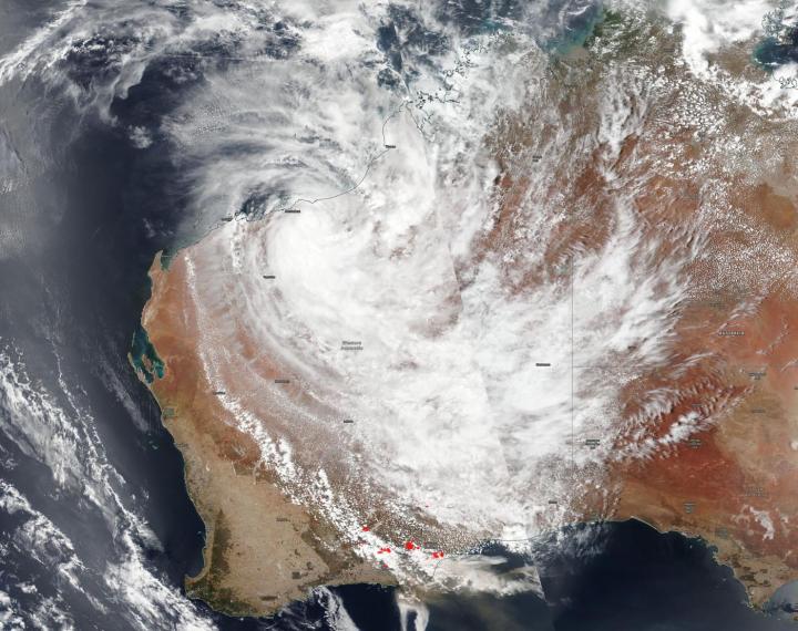 image: NASA-NOAA's Suomi NPP satellite captured an image of Tropical Storm Blake covering a good portion of Western Australia on January 8, 2020 although its center is just inland from the Kimberley coast. The red spots at the southern extent of the state indicate wildfires. The brown stream extending over the Southern Indian Ocean and into the Great Australian Bight is the smoke generated from the fires.