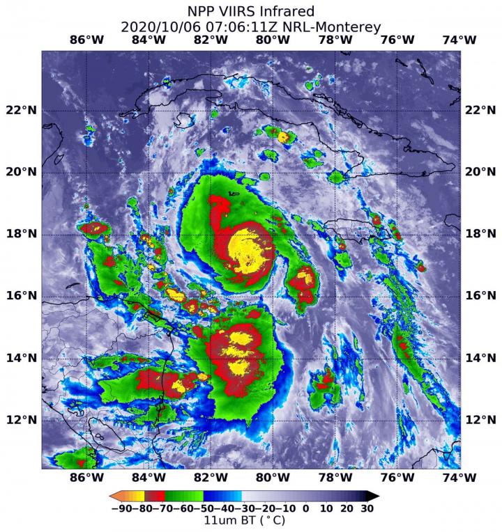 Infrared imagery from NASA-NOAA's Suomi NPP satellite revealed that Hurricane Delta has been rapidly growing stronger and more powerful. Infrared imagery revealed that powerful thunderstorms circled the eye of the hurricane and southern quadrant as it moved through the Caribbean Sea on Oct. 6.
