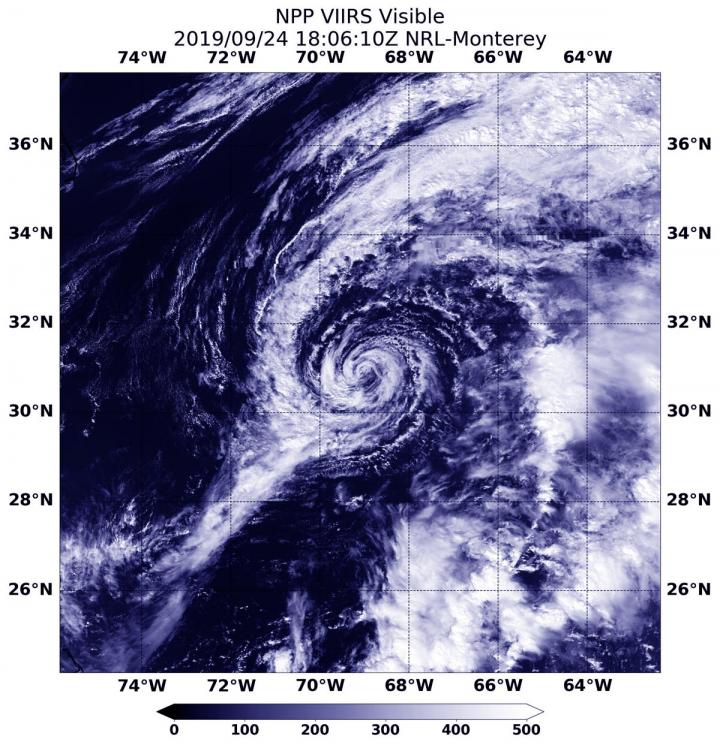 On Sept. 25 at 12:48 p.m. EDT (1806 UTC), the Visible Infrared Imaging Radiometer Suite (VIIRS) instrument aboard Suomi NPP provided a visible image Jerry. The VIIRS image showed the storm as swirls of clouds with no organized deep convection/developing strong thunderstorms. NOAA's National Hurricane Center or NHC said since around 11 a.m. EDT (1500 UTC) yesterday [Sept. 24], that lack of strong thunderstorms was seen in earlier satellite imagery, including from NASA's Aqua and Terra satellites. As a result, Jerry was designated as a post-tropical cyclone.