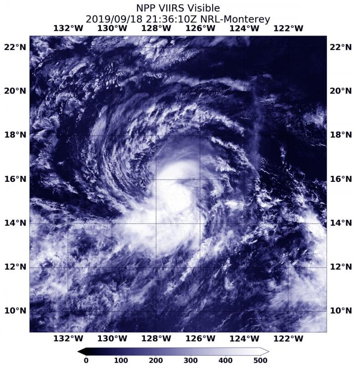 The Visible Infrared Imaging Radiometer Suite (VIIRS) instrument aboard Suomi NPP provided a visible image of Kiko on Sept. 18 at 5:36 p.m. EDT (2136 UTC) and revealed a circular area of powerful storms around the low-level center. The image showed strong bands of thunderstorms were located over the northern and southern quadrants of the storm. Those bands shifted location by the next day. On Sept. 19, the storm remained relatively compact with deep convection (strongest thunderstorms) organized in bands to the north and east of the low-level center.