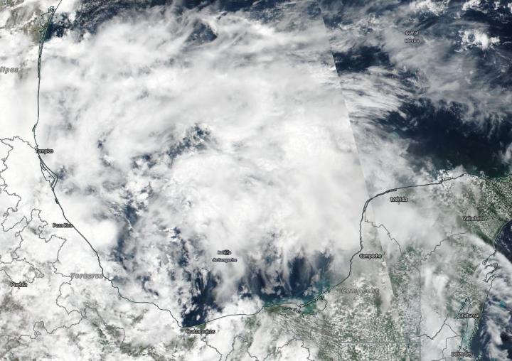 The Visible Infrared Imaging Radiometer Suite (VIIRS) instrument aboard Suomi NPP provided a visible image of the storm. The VIIRS image showed fragmented bands of thunderstorms around System 91L's circulation center which filled the Bay of Campeche and stretched north into the western Gulf of Mexico. System 91L's clouds extend from Mexico's Yucatan state to the west bordering and including the states of Campeche, Tabasco, Veracruz and as far north as Tamaulipas.