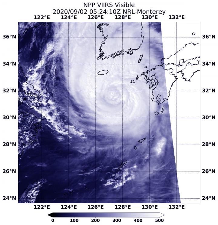 image: NASA-NOAA's Suomi NPP satellite passed over the East China Sea on Sept. 2 at 1:24 a.m. EDT (0524 UTC) and saw Typhoon Maysak headed for landfall in southern South Korea.