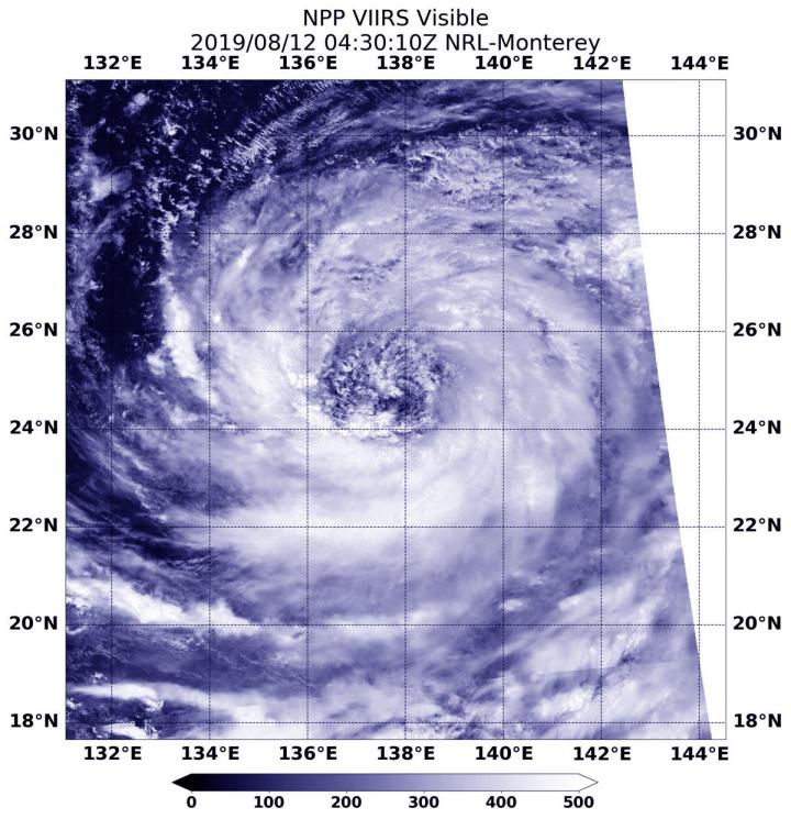 image: On Aug. 12, 2019, NASA-NOAA's Suomi NPP satellite passed over the Northwestern Pacific Ocean and captured a visible image of Krosa that showed a very large tropical storm.