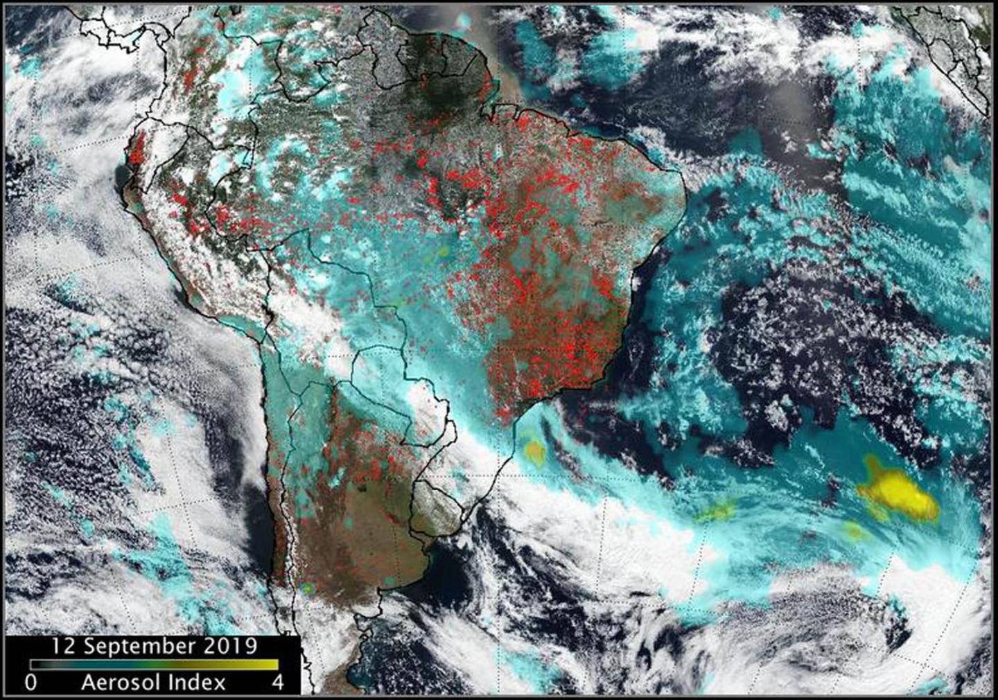 image: Fires in South America generated smoke that continues to create a long plume east into the Atlantic Ocean. Fires over western Brazil were generating aerosols at a level 2.0 on the index. Higher aerosol concentrations, as high as 4.0 were seen off the southeastern coast of Brazil as a result of the fires in the region.