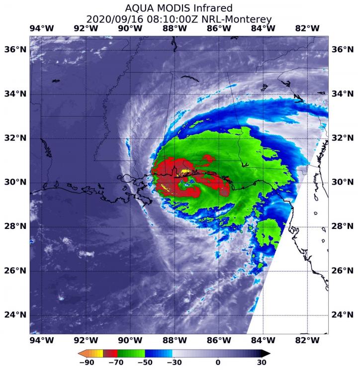On Sept. 16 at 4:10 a.m. EDT (0810 UTC) the Moderate Resolution Imaging Spectroradiometer or MODIS instrument that flies aboard NASA's Aqua satellite used infrared light to analyze the strength of storms within Sally. MODIS found the most powerful thunderstorms were north of the eye where cloud top temperatures were as cold as minus 80 degrees Fahrenheit (minus 62.2 Celsius).