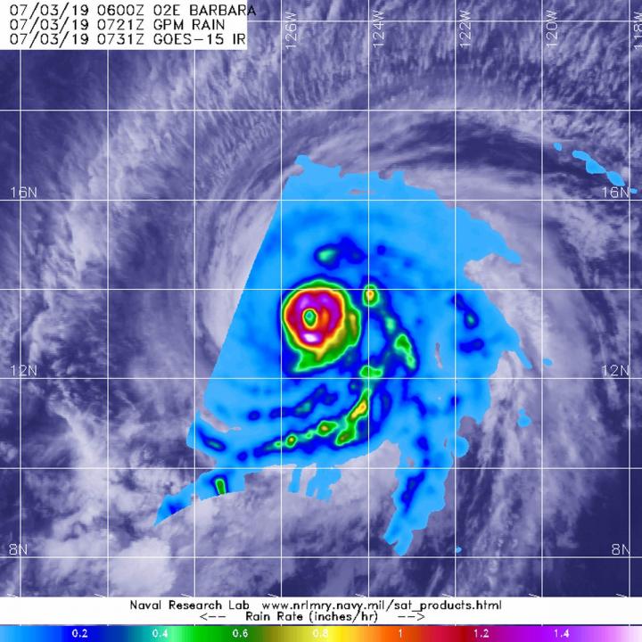 image: The GPM core satellite passed over Hurricane Barbara at 3:21 a.m. EDT (0721 UTC) on July 3, 2019. GPM found the heaviest rainfall rate (pink) was northeast of the center of circulation. There, rain was falling at a rate of more than 50 mm (2 inches) per hour. The GPM image was overlaid on a GOES-West infrared image of Barbara's clouds.