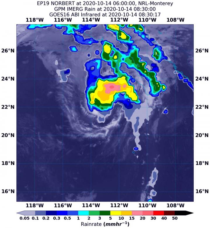 NASA's Integrated Multi-satellitE Retrievals for GPM or IMERG, which is a NASA satellite rainfall product, estimated on Oct. 14 at 4:30 a.m. EDT (0830 UTC), Norbert was generating as much as 30 mm (1.18 inches) of rain per hour near the center of circulation. The National Hurricane Center noted that the exact location has been difficult to pinpoint in the area of deep convection.