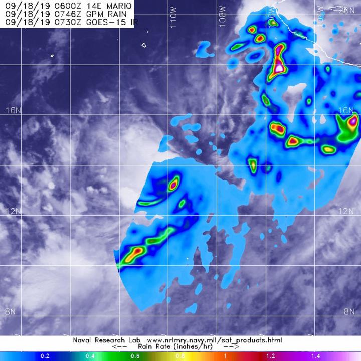 image: The GPM core satellite passed over developing Tropical Storm Mario in the eastern Pacific Ocean on Sept. 18, 2019 at 3:46 a.m. EDT (0746 UTC) and found the heaviest rainfall (pink) in the southeastern side of the storm falling at a rate of over 36 mm (about 1.4 inch) per hour. GPM data was overlaid on cloud imagery from NOAA's GOES-West satellite.