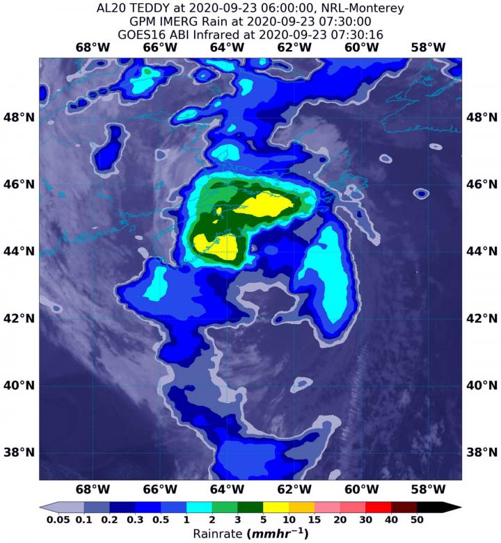 image: NASA's IMERG rainfall product estimated on Sept. 23 at 3:30 a.m. EDT (0730 UTC) that Teddy was generating between 5 and 15 mm (0.20 and 0.60 inches) of rain per hour around the center of circulation. Rainfall throughout most of the storm was estimated as falling at a rate between 0.3 and 2 mm (0.01 to 0.08 inches) per hour. The rainfall data was overlaid on infrared imagery from NOAA's GOES-16 satellite.