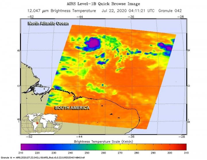 On July 22 at 12:11 a.m. EDT (0411 UTC) NASA's Aqua satellite analyzed the storm using the Atmospheric Infrared Sounder or AIRS instrument. AIRS found coldest cloud top temperatures as cold as or colder than minus 63 degrees Fahrenheit (minus 53 degrees Celsius). NASA research has shown that cloud top temperatures that cold indicate strong storms that have the capability to create heavy rain.