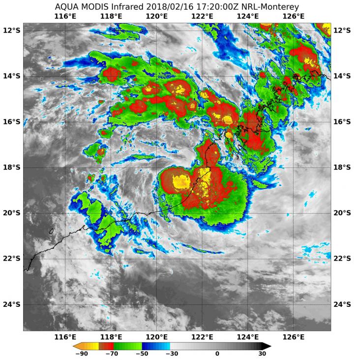 On Feb.16 at 12:20 p.m. EDT (1720 UTC) the Moderate Resolution Imaging Spectroradiometer or MODIS instrument aboard NASA's Aqua satellite analyzed Tropical Storm 10S's cloud top temperatures in infrared light. MODIS found a small area around the center of circulation where cloud top temperatures of strongest thunderstorms. Those temperatures were as cold as or colder than minus 80 degrees Fahrenheit (minus 62.2 Celsius).Cloud top temperatures that cold indicate strong storms that have the capability to create heavy rain.