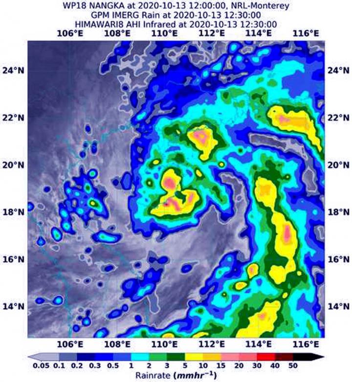 NASA's Integrated Multi-satellitE Retrievals for GPM or IMERG, which is a NASA satellite rainfall product estimated on Oct. 13 at 8 a.m. EDT (1200 UTC) that Nangka was generating as much as 30 mm (1.18 inches) of rain per hour around the center of circulation.