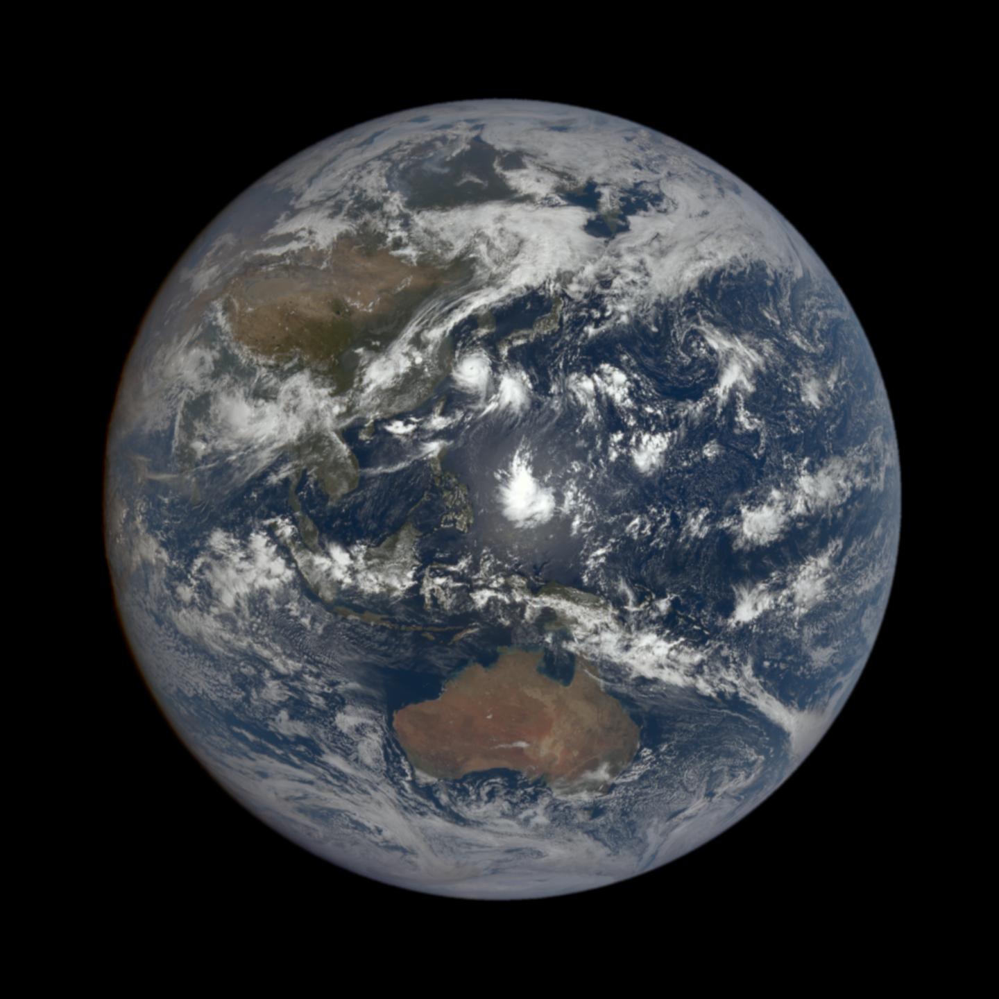 NASA's Earth Polychromatic Imaging Camera (EPIC), a four megapixel CCD camera and telescope aboard NOAA's DSCOVR satellite in orbit 1 million miles from Earth, captured a full disk image of the Northwestern Pacific Ocean side of the globe. Typhoon Bavi was moving through the Yellow Sea on Aug. 25, 2020 when the image of it was captured.