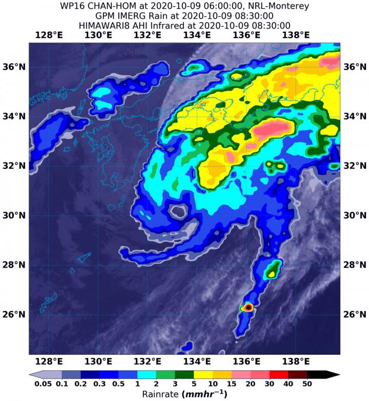 NASA's Integrated Multi-satellitE Retrievals for GPM or IMERG, which is a NASA satellite rainfall product, estimated Chan-hom's rainfall rates on Oct. 9 at 4:30 a.m. EDT (0830 UTC).