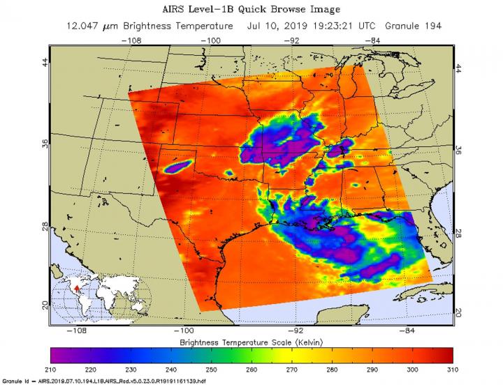 An infrared look by NASA's Aqua satellite on July 10, 2019 at 3:23 p.m. EDT (1923 UTC) revealed where the strongest storms were located within Potential Tropical Cyclone 2. The Atmospheric Infrared Sounder or AIRS instrument aboard NASA's Aqua satellite analyzed cloud top temperatures and found cloud top temperatures of strongest thunderstorms as cold as or colder than minus 63 degrees Fahrenheit (minus 53 degrees Celsius) circling the center (which is still not well-defined) and in thunderstorms northwest of the center, extending over southern Louisiana. Cloud top temperatures that cold indicate strong storms that have the capability to create heavy rain.