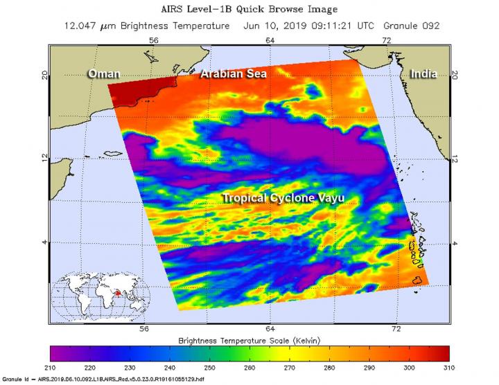 image: On June 10, at 0511 UTC (0911 UTC) the AIRS instrument aboard NASA's Aqua satellite analyzed cloud top temperatures of Tropical Cyclone Vayu in infrared light. AIRS found coldest cloud top temperatures (purple) of strongest thunderstorms were as cold as or colder than minus 63 degrees Fahrenheit (minus 53 degrees Celsius).