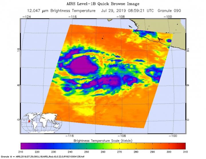 image: On June 29, 2019 at 0459 UTC (0859 UTC) the AIRS instrument aboard NASA's Aqua satellite analyzed cloud top temperatures of Tropical Storm Flossie in infrared light. AIRS found coldest cloud top temperatures (purple) of strongest thunderstorms were as cold as or colder than minus 63 degrees Fahrenheit (minus 53 degrees Celsius).
