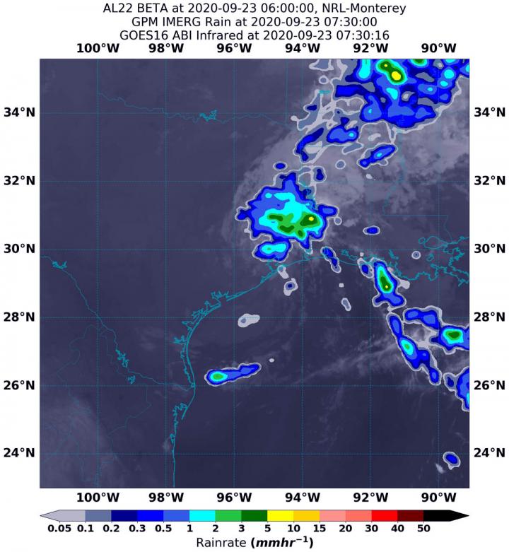 image: NASA's IMERG rainfall product estimated on Sept. 23 at 3:30 a.m. EDT (0730 UTC) that Beta was generating between 1 and 5 mm (0.04 and 0.2 inches) of rain per hour around the center of circulation in east Texas and in areas extending northeast into Louisiana and out over the Gulf of Mexico. Rainfall throughout most of the storm was estimated as falling at a rate between 0.3 and 1 mm (0.01 to 0.04 inches) per hour. The rainfall data was overlaid on infrared imagery from NOAA's GOES-16 satellite.