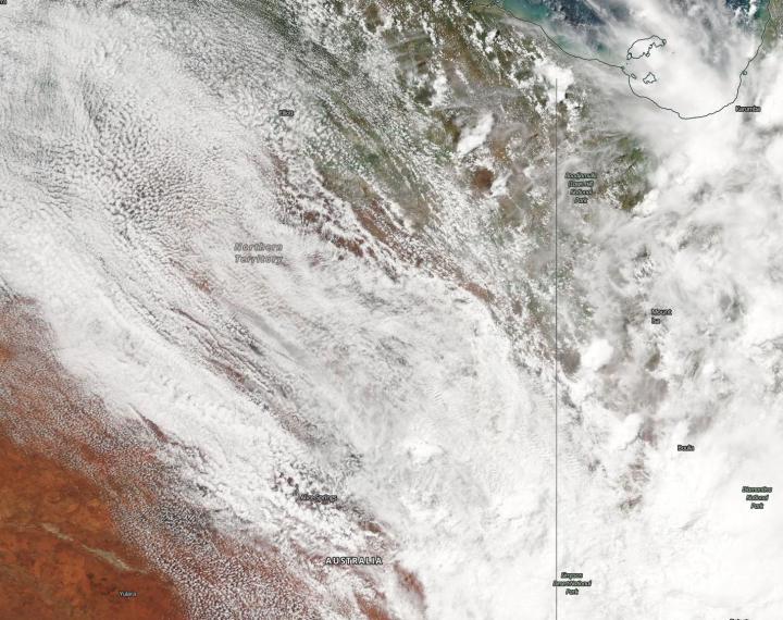 image: On Mar. 4, 2020, the MODIS instrument that flies aboard NASA's Aqua satellite provided a visible image of Esther's remnant clouds centered over the Barkly area of the Northern Territory.