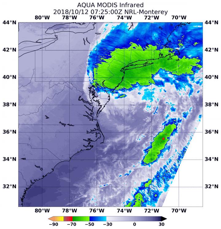 At 3:25 a.m. EDT (0725 UTC) on Oct. 12, the MODIS instrument that flies aboard NASA's Aqua satellite gathered infrared data on Post-Tropical Cyclone Michael. Infrared data provides temperature information. Strongest thunderstorms appeared over eastern Pennsylvania, New Jersey, southeastern New York, Connecticut, Rhode Island and Massachusetts. In those areas, storms had cloud top temperatures as cold as minus 63 degrees Fahrenheit (minus 53 Celsius). NASA research has shown that cloud tops with temperatures that cold were high in the troposphere and have the ability to generate heavy rain.