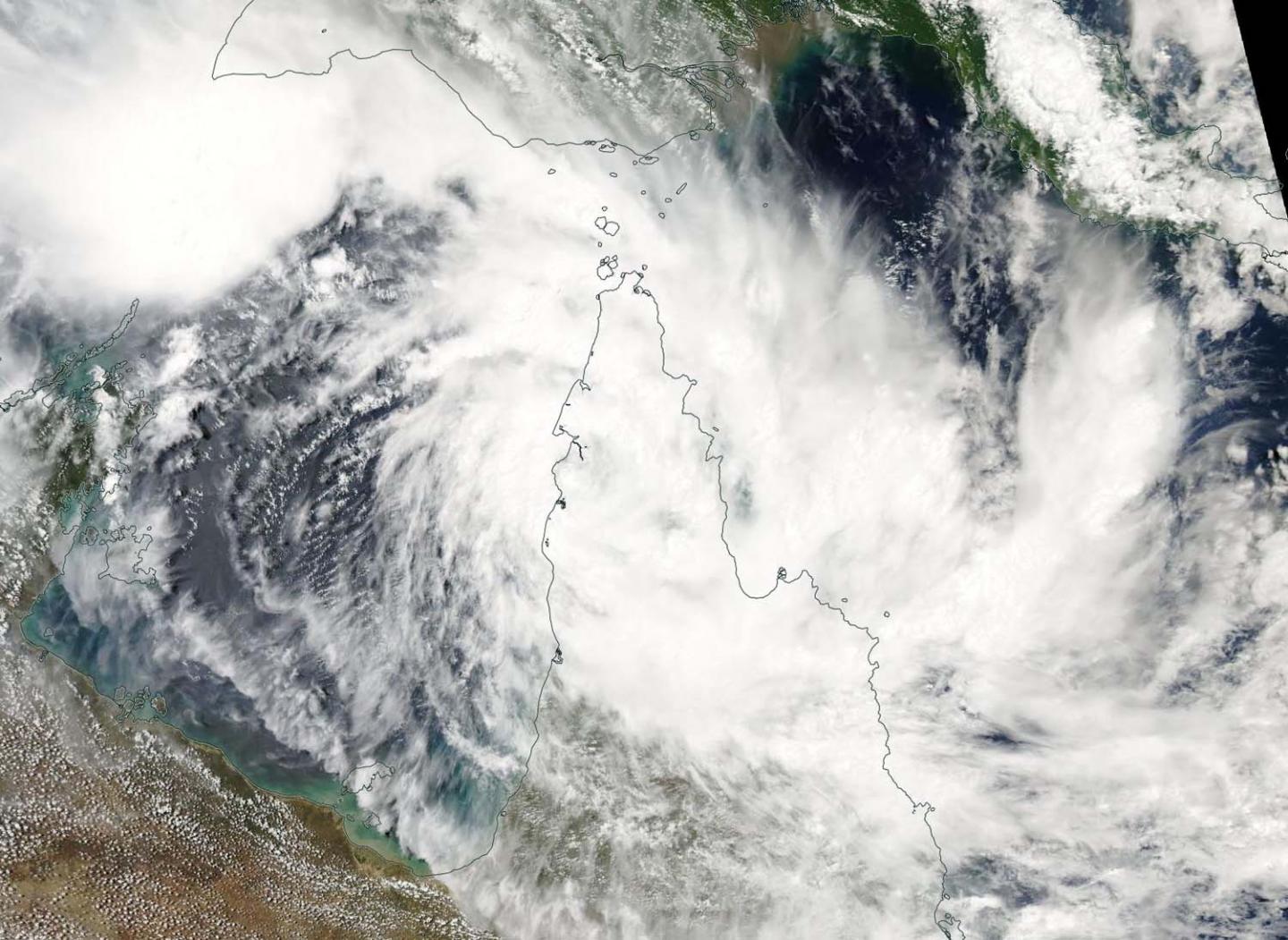 image: On March 20, 2019, the MODIS instrument aboard NASA's Terra satellite provided a visible image of Tropical Cyclone Trevor as it began exiting Queensland, Australia's Cape York Peninsula and moving into the Gulf of Carpentaria.