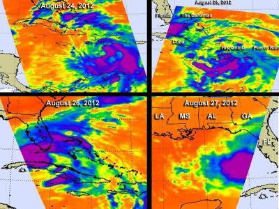 The AIRS instrument onboard NASA's Aqua satellite has been monitoring Tropical Storm Isaac for several days. Shown here are AIRS data from Aug. 24 and 25 (top left and right) and Aug. 26 and 27 (bottom left and right). AIRS has been providing infrared data about cloud temperatures, and sea surface temperatures around the storm.
