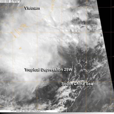 On Nov. 14 at 1200 UTC (7 a.m. EDT) TD25W had maximum sustained winds near 25 knots (28.7 mph/46.3 kph). It was centered near 8.3 North latitude and 106.6 East longitude, about 160 nautical miles (184.1 miles/296.3 km) south of Ho Chi Minh City, Vietnam. TD25W is moving to the west-northwest at 14 knots (16.1 mph/26 kph).