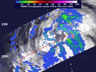 When NASA's Tropical Rainfall Measuring Mission (TRMM) satellite passed over Tropical Storm Maliksi on Oct. 2 at 1206 UTC (8:06 a.m. EDT), the precipitation radar instrument detected light rainfall occurring over most of the storm. The heaviest rainfall was moderate was falling east of the center at a rate between .78 to 1.57 inches/20 to 40 mm per hour. There was a small area of heavy rainfall just east of the center where rain was falling at 2 inches (50 mm) per hour.