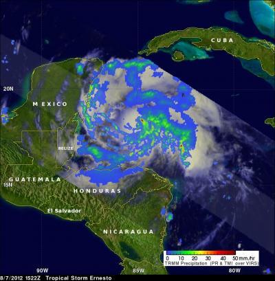 NASA's TRMM satellite has been measuring the heavy rainfall in Ernesto, and some of the rainfall totals may reach one foot in Central America. NASA's Aqua satellite spotted a large area of the strong thunderstorms generating that heavy rainfall, wrapped around the storm's center. Ernesto made landfall in the Yucatan and is currently tracking west over land.