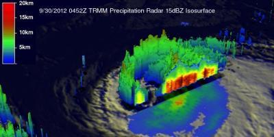 TRMM PR data were used to also create a 3-D view from the northeast that showed convective thunderstorms in the northwestern part of the hurricane were reaching to heights of about 12km (~7.5 miles).