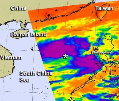 Infrared imagery from the AIRS instrument aboard NASA's Aqua satellite captured this image of Tropical Storm Gaemi on Oct. 2 at 0517 UTC. The purple areas indicate the most powerful thunderstorms with coldest cloud top temperatures. The asterisk (*) indicates the center.