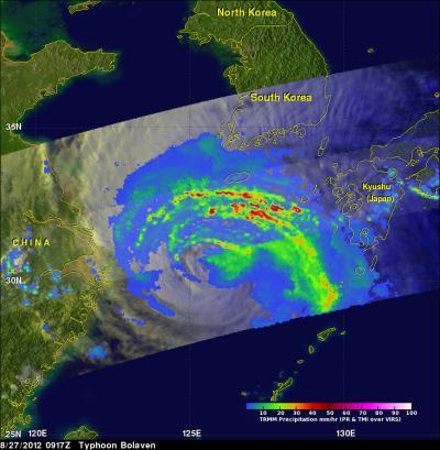On Aug. 27, NASA's Tropical Rainfall Measuring Mission or TRMM satellite monitored the rainfall rates within Tropical Storm Bolaven. At the time TRMM passed over, Bolaven was still a typhoon. TRMM captured rainfall data at 0917 UTC (about 5:17 p.m. Korea local time/5:17 a.m. EDT) and at 12:33 UTC (8:33 p.m. Korea local time/8:33 a.m. EDT). Bolaven has been generating heavy rainfall and that has been falling over both South and North Korea. Data from TRMM's Microwave Imager (TMI) and Precipitation Radar (PR) instruments showed that numerous rain bands north of Bolaven's center were dropping precipitation at a rate greater than 75 mm/hr (~2.95 inches). That heavy rainfall is cause for concern of flooding as Bolaven makes landfall and moves inland over North Korea and southeastern China.