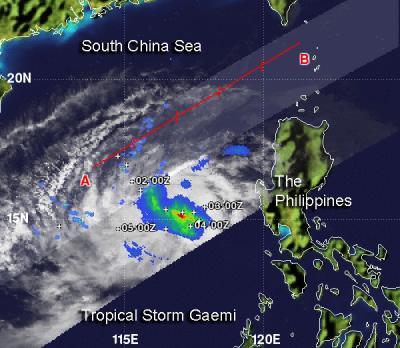 When NASA's TRMM satellite passed over Tropical Storm Gaemi on Oct. 3 at 1241 UTC (8:41 a.m. EDT), light rainfall (blue) was occurring over most of the storm. Moderate rain (green and orange) was falling at a rate between .78 to 1.57 inches/20 to 40 mm per hour and surrounded a small area of heavy rainfall (red) circling tightly around the center. The heaviest rain was falling at 2 inches (50 mm) per hour.