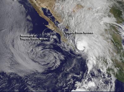 As Miriam fades, Tropical Storm Norman just formed near the Baja mid-day on Sept. 28. The GOES-15 satellite image on Sept. 28 clearly showed Tropical Storm Norman's birth, about 90 miles south-southeast of Baja California. The low appeared somewhat poorly defined on the satellite image, but is producing a large area of showers and thunderstorms within a few hundred miles of the coast of western Mexico.