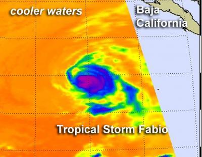 When NASA's Aqua satellite passed over Tropical Storm Fabio on July 16 at 2135 UTC (5:35 p.m. EDT), the Atmospheric Infrared Sounder (AIRS) instrument captured temperatures of cloud tops and the sea surface. Cloud top temperatures were warming indicating the strength of uplift in the storm was decreasing and the power was going out of the cyclone. The weakening trends is a result of ocean temperatures. When AIRS measured the sea surface temperatures around Fabio, they had dropped below 22 Celsius (71.6 Fahrenheit). Sea surface temperatures of 26.6 C (80F) are needed to maintain a tropical cyclone. When Aqua passed over Fabio early on July 17, the AIRS instrument saw the coldest cloud top temperatures were confined to a small area east of the center of circulation, an indication Fabio had weakened more.