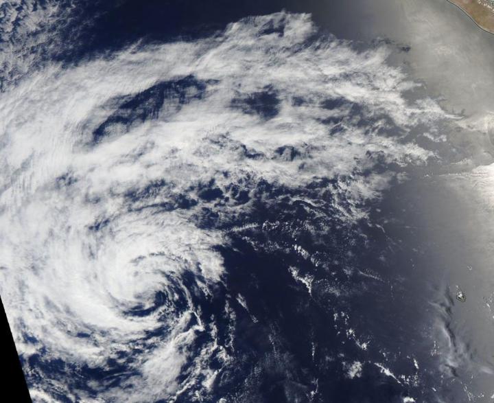 NASA's Aqua satellite passed over the Eastern Pacific Ocean later in the day and the Moderate Resolution Imaging Spectroradiometer or MODIS instrument aboard provided forecasters with a visible image of the depression. The image revealed an eastern quadrant devoid of clouds and rainfall, and the bulk of clouds were pushed northeast of the center. That's because the storm encountered southeasterly vertical wind shear (outside winds blowing at different speeds at various levels in the atmosphere) that helped weaken the storm.