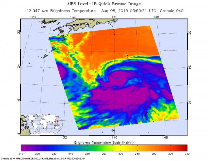 image: On Aug. 7 at 11 p.m. EDT (0359 UTC) the AIRS instrument aboard NASA's Aqua satellite analyzed cloud top temperatures of Typhoon Krosa in infrared light. AIRS found coldest cloud top temperatures (purple) of strongest thunderstorms were as cold as or colder than minus 63 degrees Fahrenheit (minus 53 degrees Celsius). Krosa had a 40 nautical-mile-wide eye.