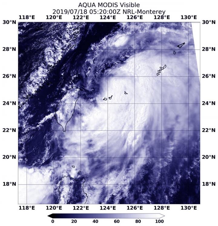 On July 18 at 1:20 a.m. EDT (0520 UTC), the Moderate Resolution Imaging Spectroradiometer or MODIS instrument aboard NASA's Aqua satellite provided a visible image of Danas that showed a large storm over Japan's Ryuku Island chain. The image shows that Danas is being affected by vertical wind shear, where winds at different levels of the atmosphere around the tropical cyclone are pushing against it and affecting the storm's shape. The Joint Typhoon Warning Center noted, "A large area of deep convection sheared 60 nautical miles southward of a consolidating low-level center.