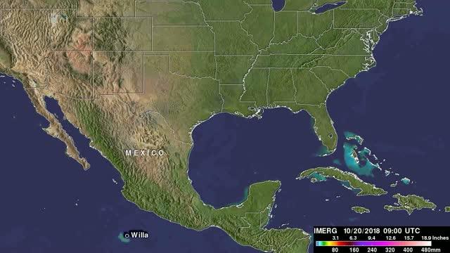 video: A rainfall accumulation analysis was generated by totaling Integrated Multi-satellitE Retrievals for GPM (IMERG) data for the period from October 20 to 26, 2018. Hurricane Willa's approximate 0000Z and 1200Z locations are shown on this analysis. Willa produced rainfall totals greater than 20 inches (508 mm) in the Pacific Ocean off Mexico's coast. IMERG data also indicated that rainfall accumulations of over 15 inches (381 mm) occurred in parts of Mexico and Southeastern Texas.