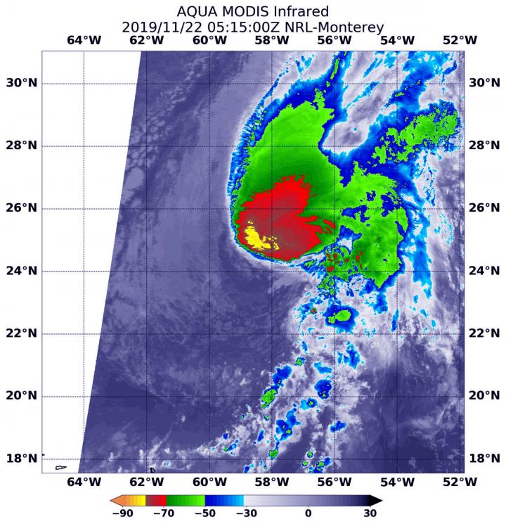 On Nov. 22 at 1:15 a.m. EST (0515 UTC), the Moderate Resolution Imaging Spectroradiometer or MODIS instrument that flies aboard NASA's Aqua satellite used infrared light to analyze the strength of storms within the tropical cyclone. MODIS found those strongest storms only in the southwestern side of the storm where cloud top temperatures were as cold as or colder than minus 80 degrees Fahrenheit (minus 62.2 Celsius). NASA research has found that cloud top temperatures that cold indicate strong storms with the potential to generate heavy rainfall.