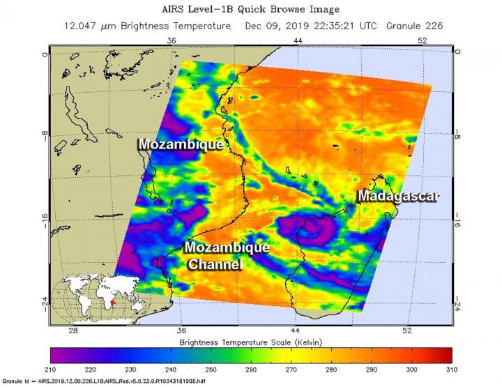 On Dec. 9 at 5:35 p.m. EST (2235 UTC) NASA's Aqua satellite analyzed the storm using the Atmospheric Infrared Sounder or AIRS instrument. AIRS found coldest cloud top temperatures as cold as or colder than minus 63 degrees Fahrenheit (minus 53 degrees Celsius) around the center and in a band of thunderstorms east of center over northwestern Madagascar. NASA research has shown that cloud top temperatures that cold indicate strong storms that have the capability to create heavy rain.