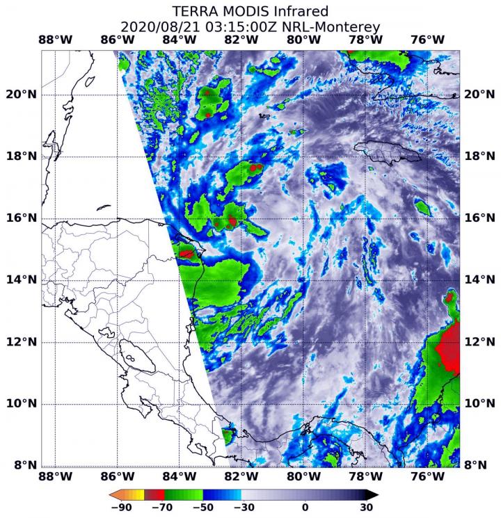On Aug. 21 at 0315 UTC (Aug. 20 at 11:15 p.m. EDT), the Moderate Resolution Imaging Spectroradiometer or MODIS instrument that flies aboard NASA's Terra satellite gathered infrared data from the depression that found the coldest cloud top temperatures were as cold as or colder than minus 60 degrees Fahrenheit (minus 51.1 Celsius). The strongest storms were mostly on the western side of the storm. However, a fragmented band of thunderstorms extending to the southeast also contained strong storms. NASA research has found that cloud top temperatures that cold can generate heavy rainfall. Some of that heavy rain was affecting Mexico's Yucatan Peninsula.