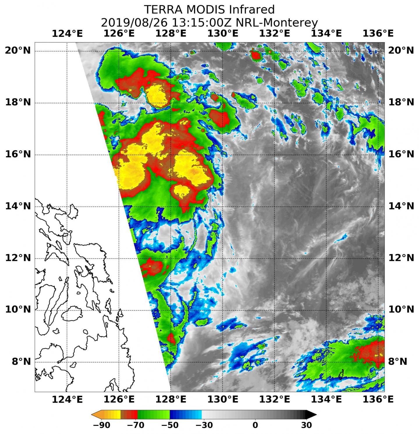 On August 26 at 9:15 a.m. EDT (1315 UTC), the Moderate Imaging Spectroradiometer or MODIS instrument that flies aboard NASA's Terra satellite found those strongest storms had cloud top temperatures as cold as minus 80 degrees Fahrenheit (minus 62.2 Celsius). Cloud top temperatures that cold indicate strong storms with the potential to generate heavy rainfall.