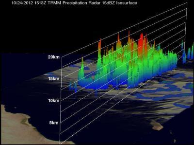 TRMM PR and TMI data showed that rain at the surface was falling at a rate of up to 41 mm/hour (~1.6 inches) in the forming tropical cyclone. Bands of thunderstorms were also wrapping tightly into a well-defined low level center of circulation. TRMM PR data also was also used to create a 3-D image that showed the vertical structure of convective storms in the area. The view showed some towering convective storms were reaching heights of over 16 km (~9.9 miles).