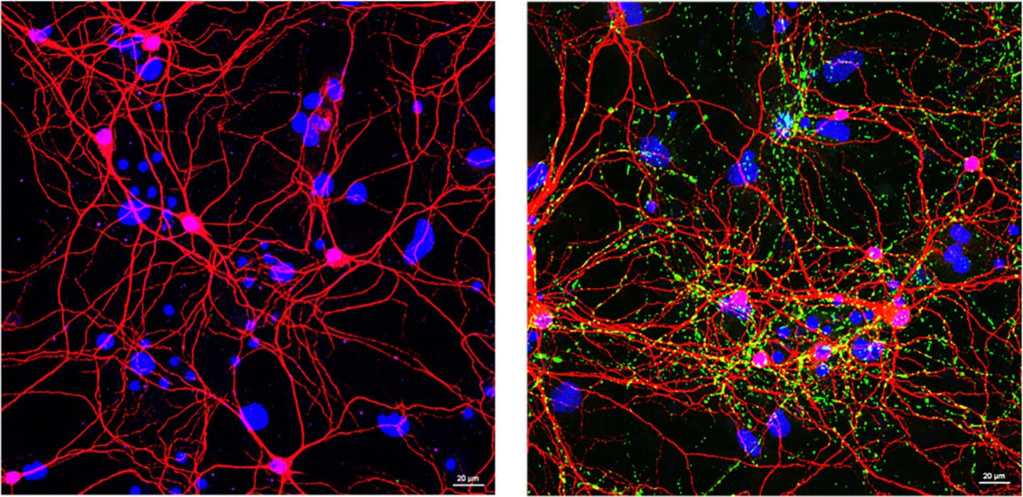 image: Left, imaging of healthy neurons from mouse brain. Right, imaging of damaged neurons by PD protein clumps.