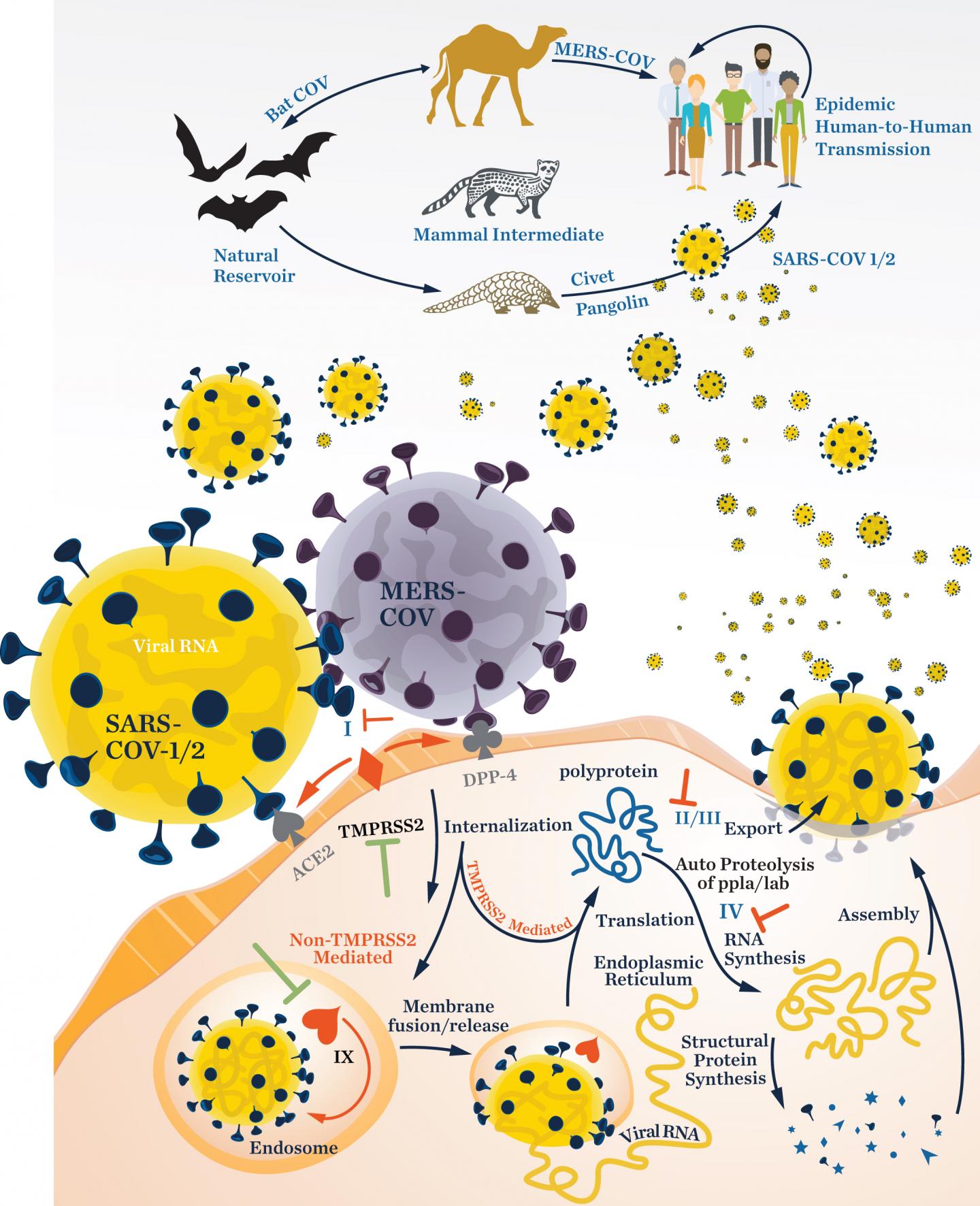 image: Lifecycle of Coronavirus as represented by SARS-CoV-1/2 and MERS-CoV viruses