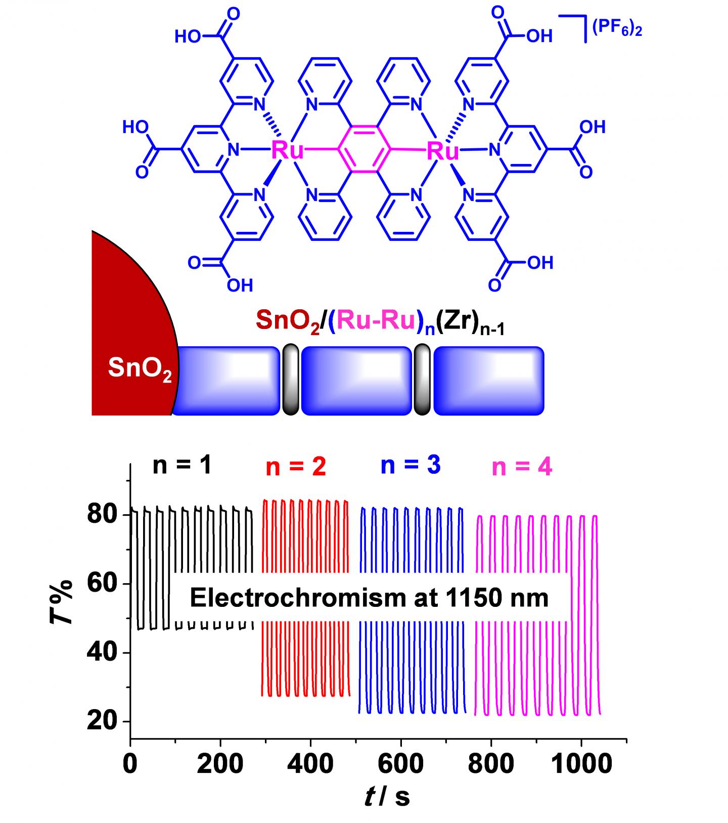 Currently (4), stimulated by the dye adsorption method commonly used in the fabrication of dye-sensitized solar cells, they prepared multilayer films of bridged diruthenium complexes by layer-by-layer (LBL) coordination assembly on metal oxide substrate and realized high-performance NIR electrochromism at 1150 nm (Figure 1).